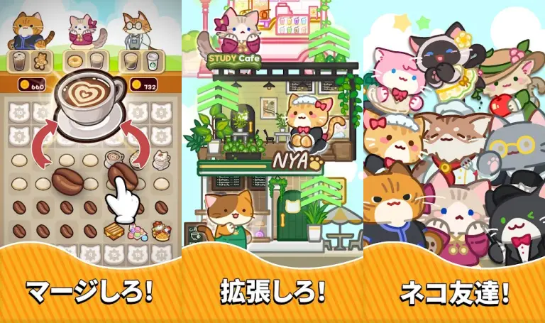 同じアイテムを重ねて料理やドリンクを作りながら、ねこたちと一緒にカフェを運営していくマージパズルゲームです。